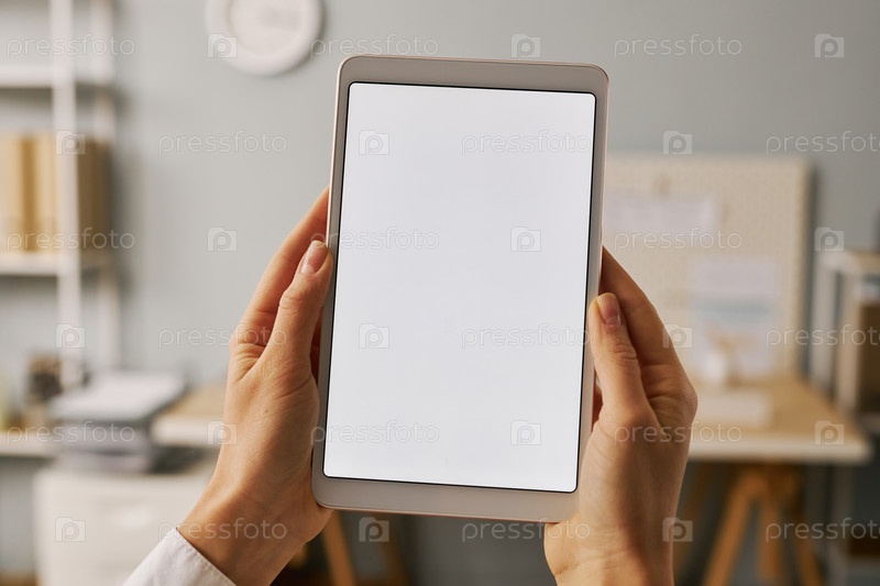Закрытые женские руки, держащие цифровой планшет с белым экраном макет в офисе