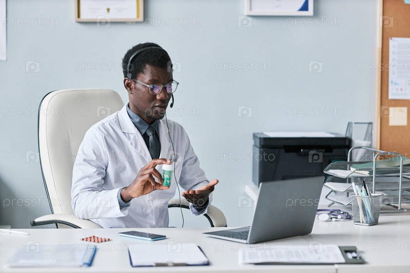 Врач держит бутылку с таблетками, указывая на нее во время онлайн-консультации