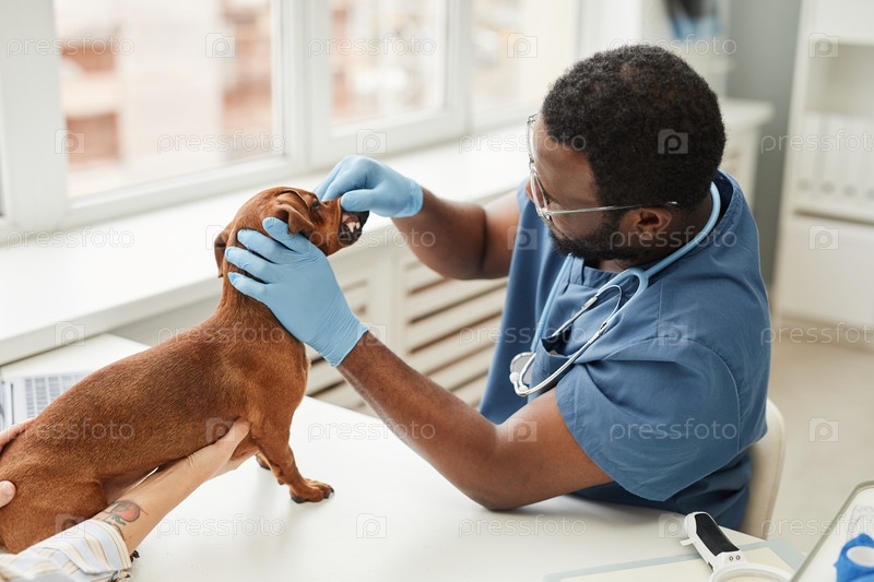 Молодой врач в синей медицинской одежде осматривает зубы больной собаки