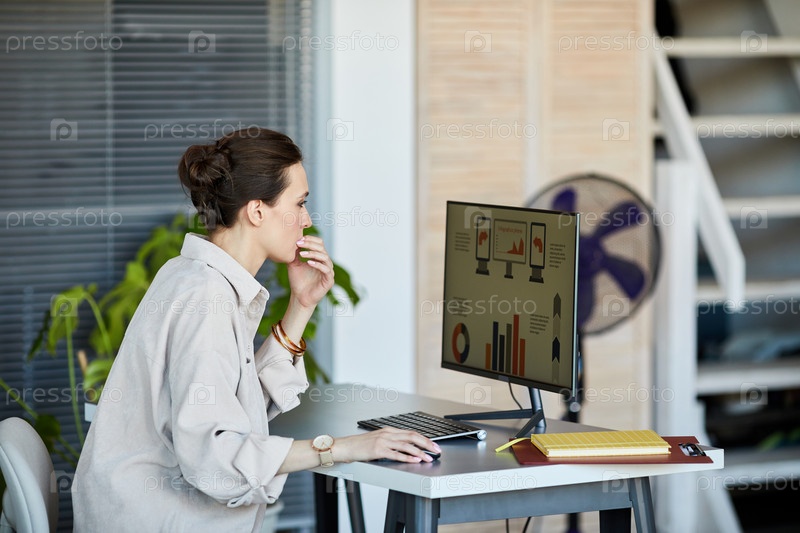 Молодой мыслящий аналитик в умной повседневной одежде смотрит на данные на экране компьютера
