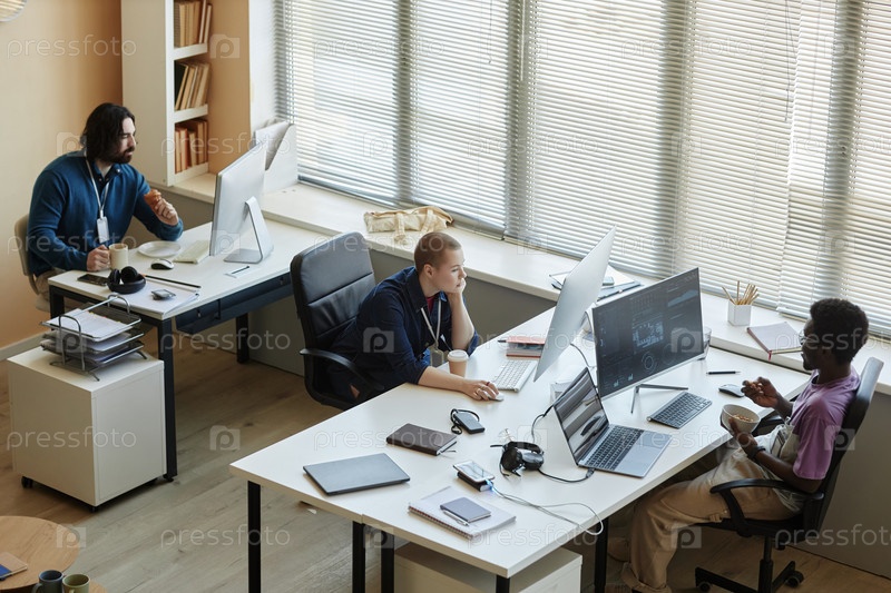 Молодые межкультурные коллеги, которые едят закуски перед экранами компьютеров