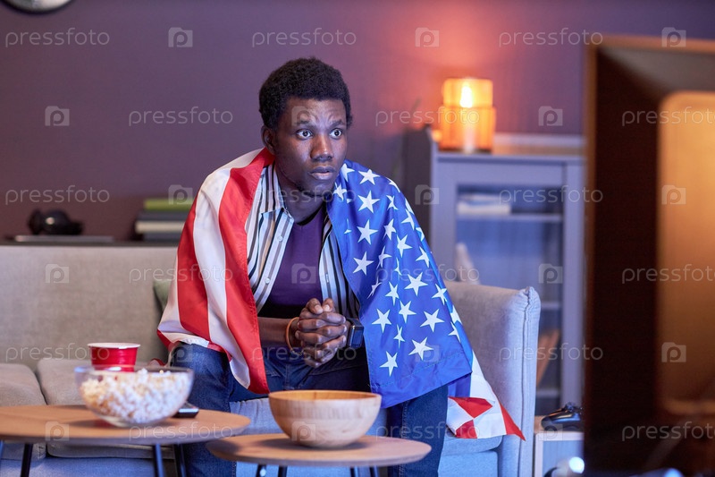 Молодой чернокожий мужчина как спортивный фанат смотрел матч по телевизору дома и носил флаг США