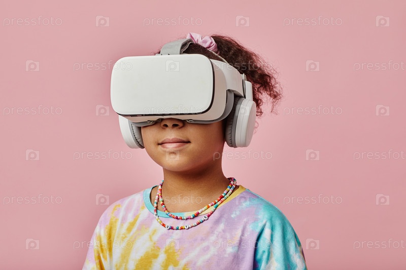 Ученица с VR-гарнитурой стоит перед камерой во время игры