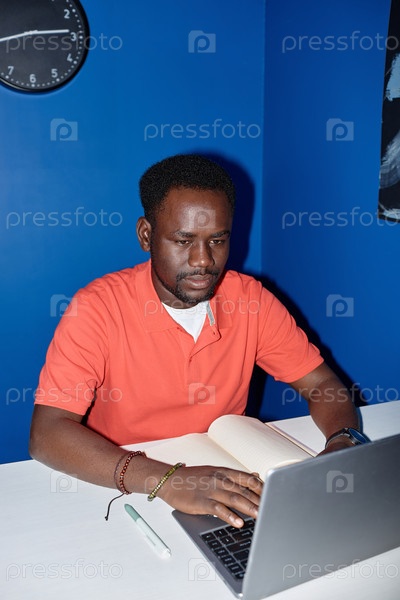 Живой, сосредоточенный чернокожий мужчина использует ноутбук на рабочем месте