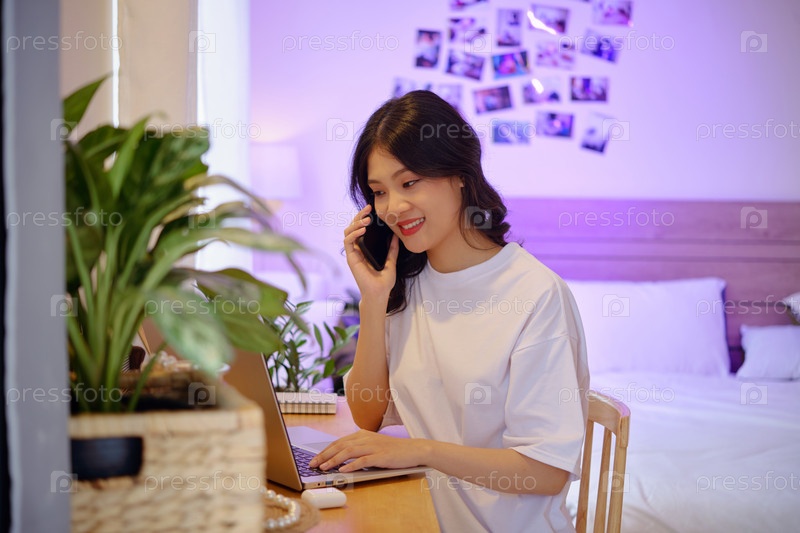 Молодая женщина в пижаме разговаривает по телефону