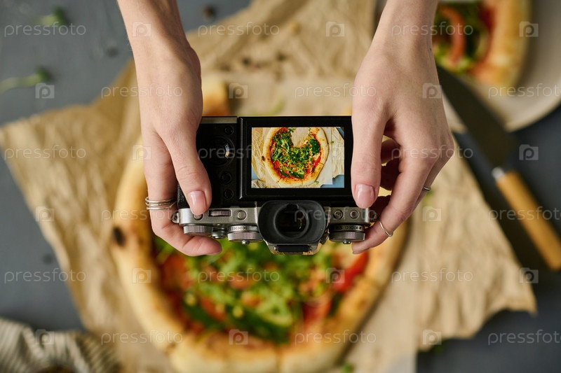 Женщина фотографирует пиццу с помощью камеры