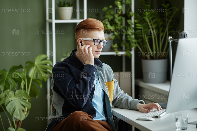 Красноволосый молодой человек в зеленом офисе