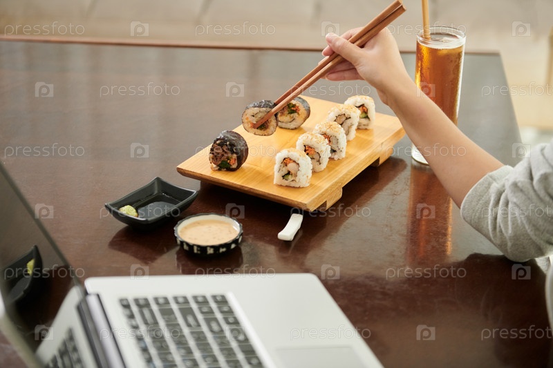 Женщина-фрилансер ест суши