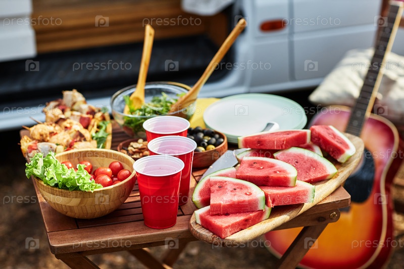 Пикник с фруктами и жареным мясом на свежем воздухе