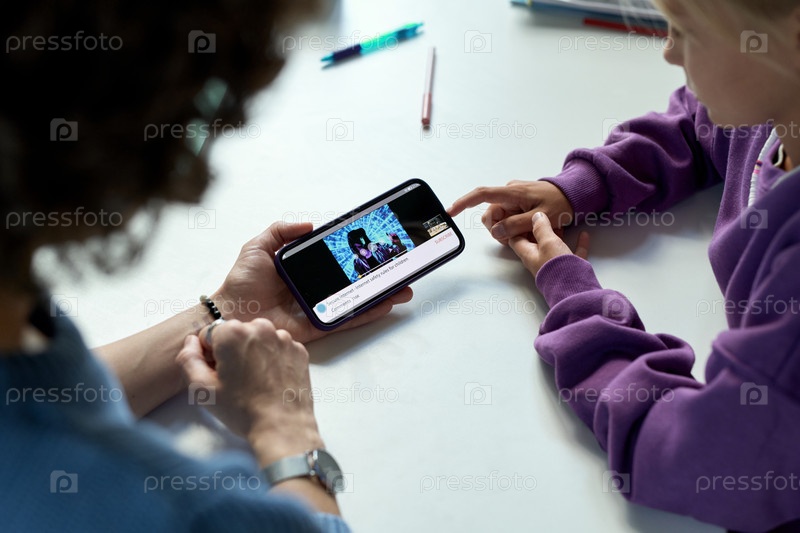 Мать показывает видео на смартфоне своему ребенку