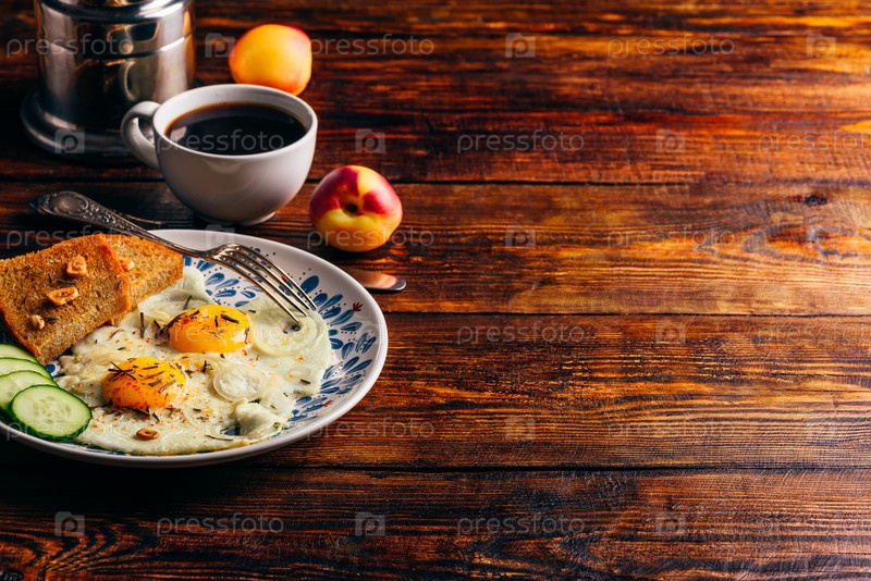 Тост на завтрак с яичницей, овощами, фруктами и кофе