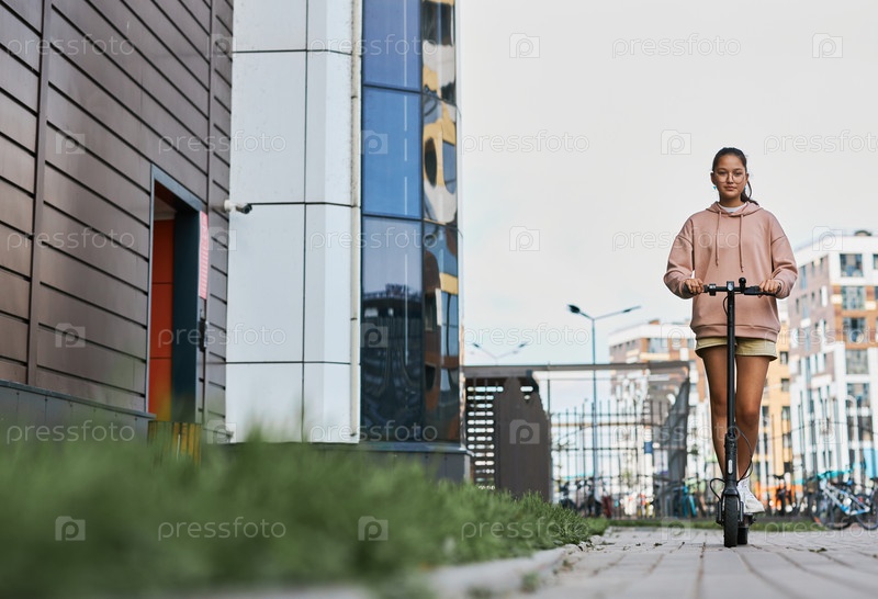 Милая школьница-подросток в повседневной одежде едет на электрическом скутере