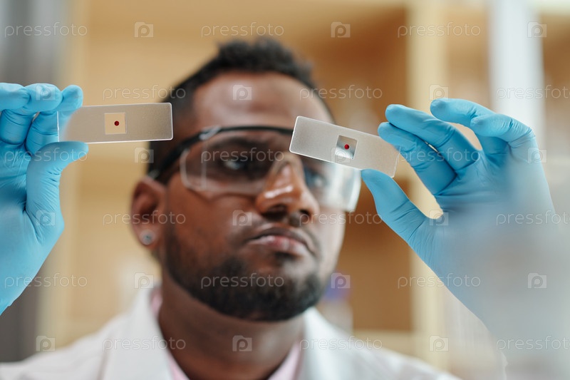 Сосредоточьтесь на перчатках ученых, держащих слайды и сравнивающих образцы