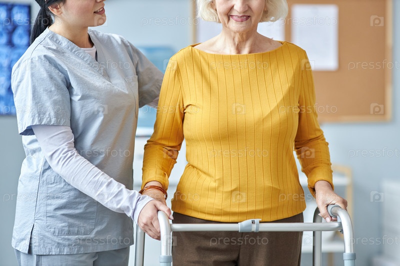 Пожилая женщина, пользующаяся мобильным ходунком в клинике с помощью медсестры