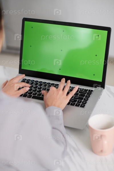 Ноутбук с черным зеленым экраном и руками креативного веб-дизайнера над клавиатурой