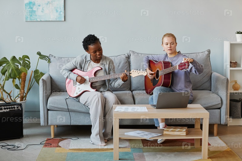 Две женщины-музыканты играют на гитаре дома
