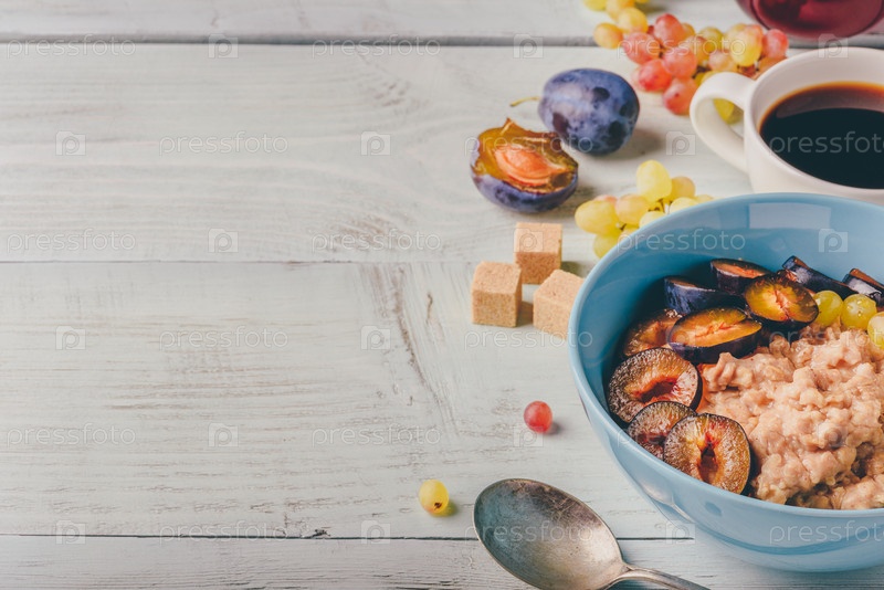 Каша со сливой, виноградом и чашкой кофе