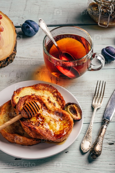Французские тосты с медом, фруктами и чаем