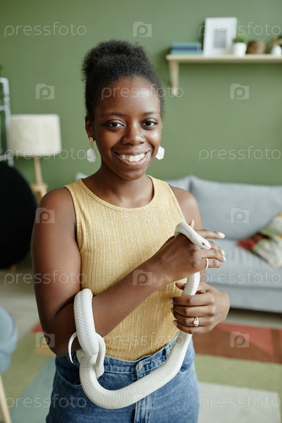 Молодая веселая афроамериканская женщина с белым крысиным змеем в руках