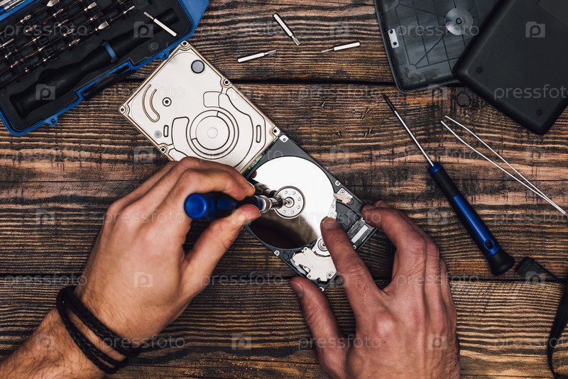 Две руки с отверткой разбирают жесткий диск