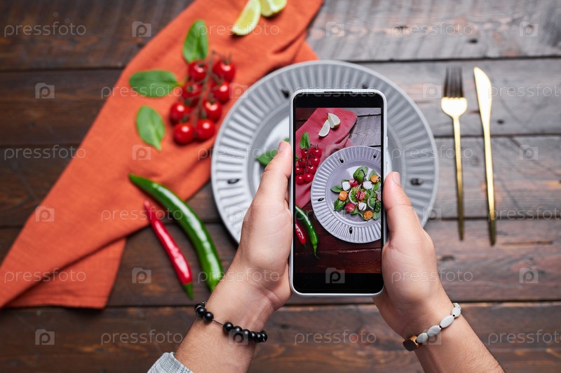 Мужчина делает фото еды на смартфоне