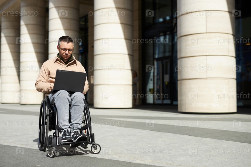 Мужчина с ограниченными возможностями, использующий ноутбук снаружи