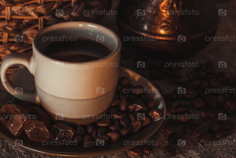 Чашка кофе на ткани с фасолью, темным конфетным сахаром, горшками, корзиной и тортом