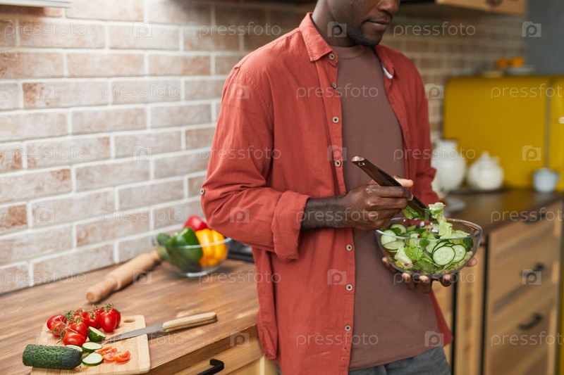 Молодой человек делает салат на кухне