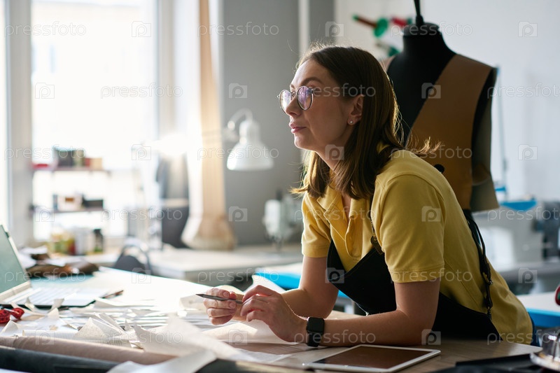 Задумчивая швея в очках, сидящая за столом с рисунками шитья