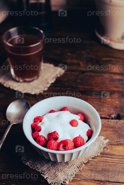Чаша летнего десерта со спелой малиной и греческим йогуртом