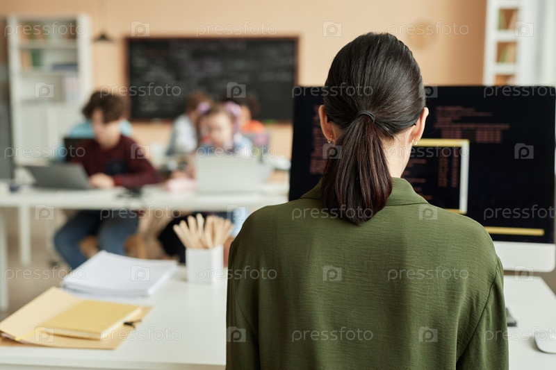 Обратный взгляд на учительницу, использующую компьютер в классе программирования