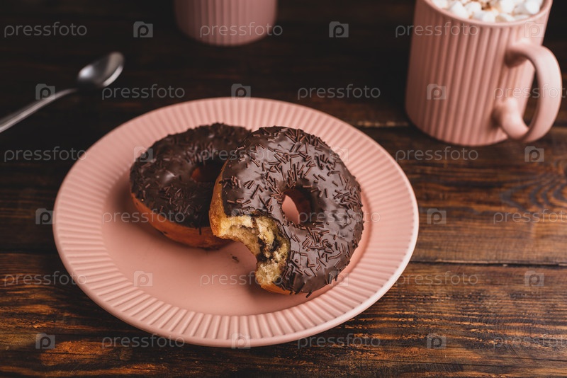 Шоколадный пончик с кусочком и кружками горячего шоколада