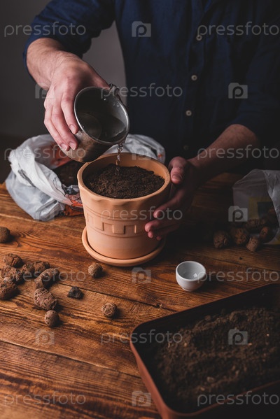 Мужчина наливает воду в кастрюлю со свежими семенами тимьяна