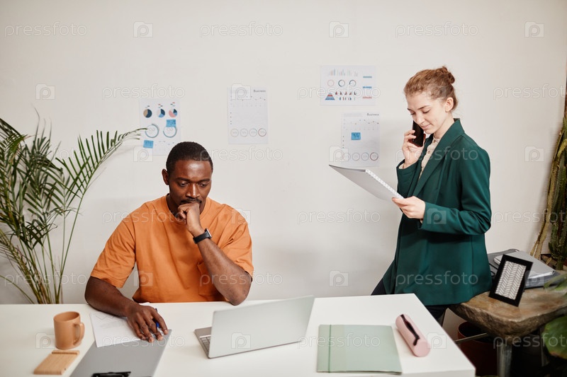 Молодой серьезный афроамериканский бизнесмен смотрит на экран ноутбука