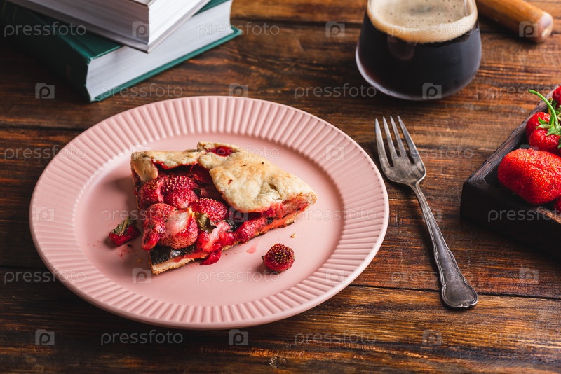 Кусочек открытого пирога с клубникой и щавелем на тарелке