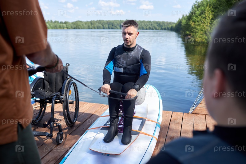 Взрослый мужчина с ограниченными возможностями на уроке вейкбординга, используя адаптивное оборудование