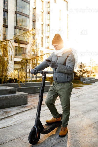 Мужчина соединяет скутер с мобильным телефоном