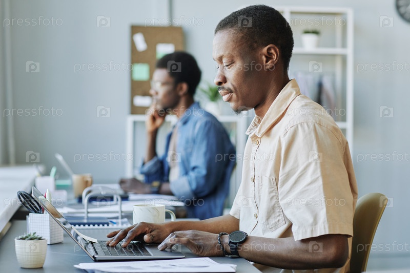 Чернокожий мужчина использует ноутбук на работе