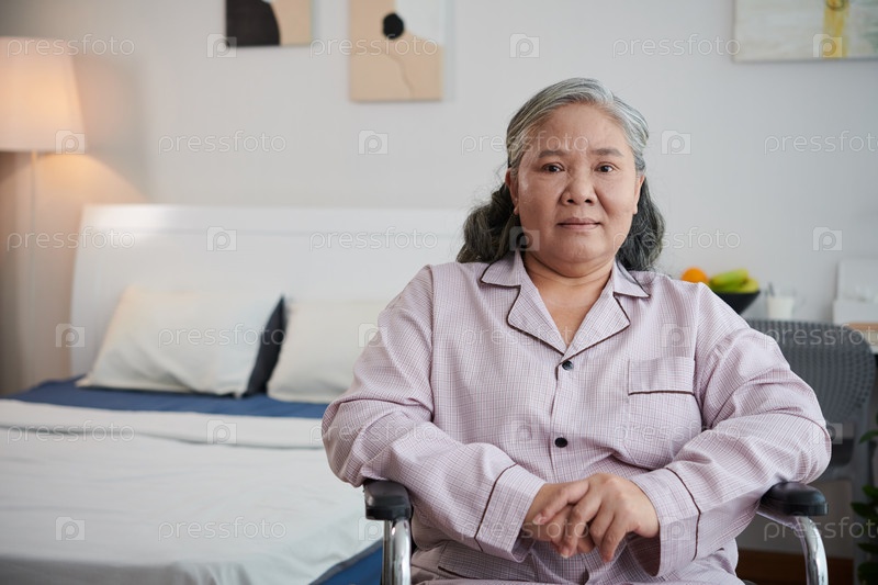 Больная азиатская женщина, сидящая в инвалидном кресле