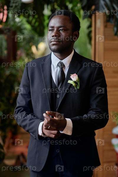 Красивый чернокожий мужчина готовится к свадебной церемонии и корректирует смокинг