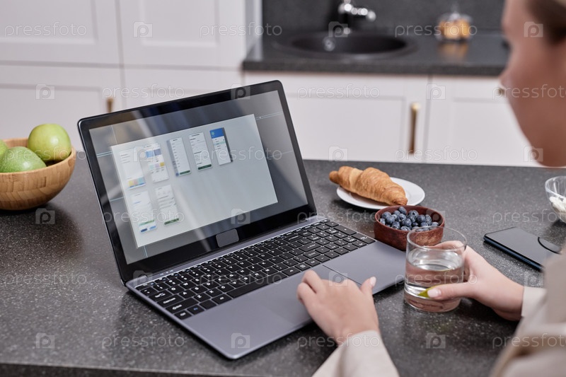 Близкий план молодой женщины, использующей ноутбук и работающей из дома во время завтрака