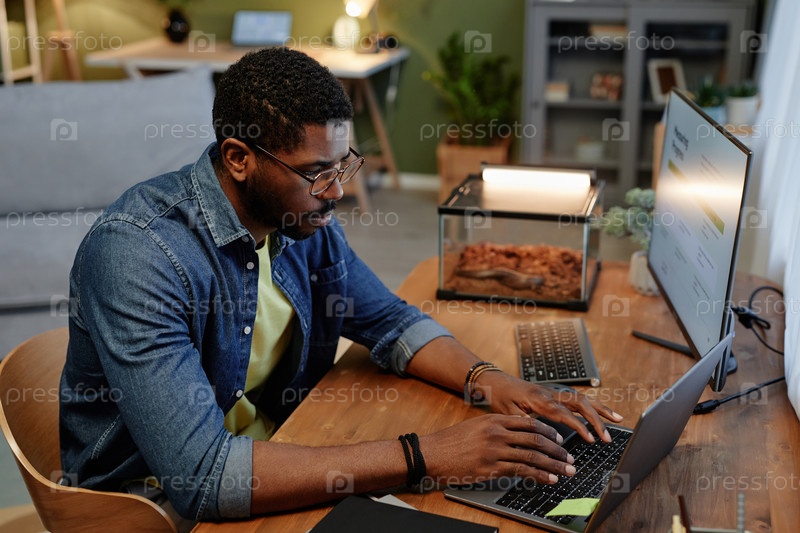 Молодой занятый аналитик или брокер, печатающий на клавиатуре ноутбука по месту работы