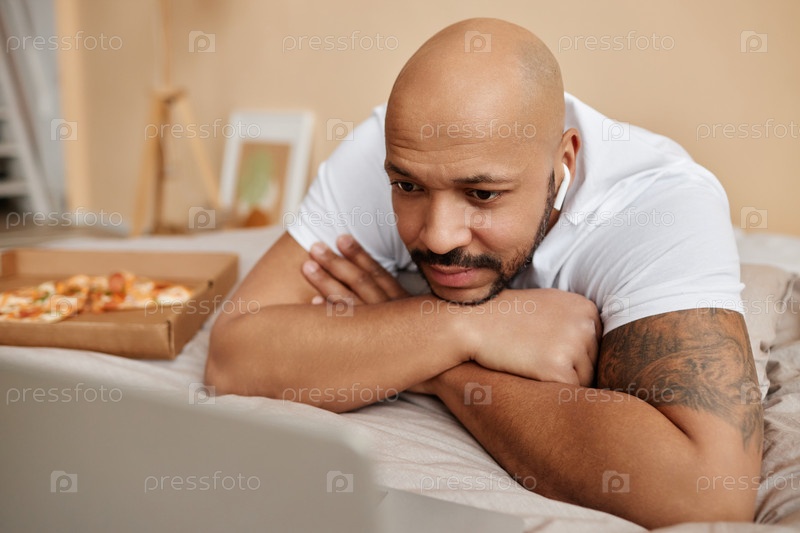 Взрослый чернокожий мужчина смотрит видео через ноутбук, лежа в постели дома