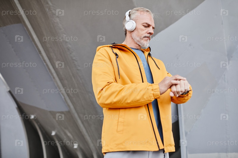 Красивый старший мужчина, носящий наушники
