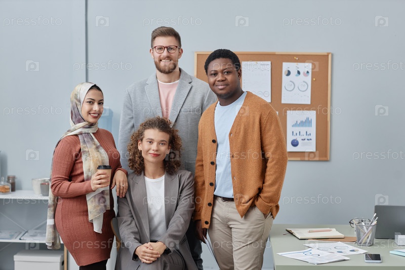 Четыре молодых уверенных в себе межкультурных экономиста в повседневной одежде смотрят на вас