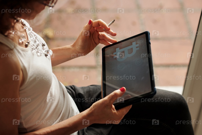 Стрессованная женщина проверяет индекс цен на биткоин