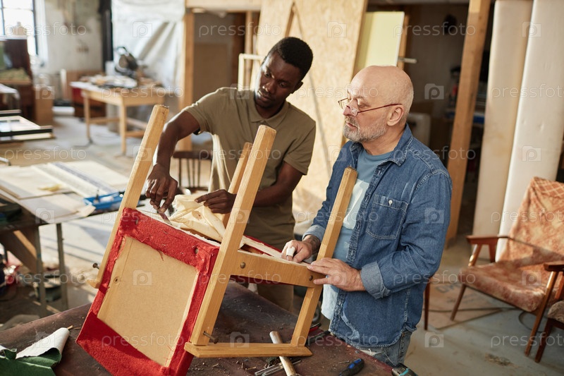 Старший ремесленник с учеником ремонтирует мебель в столярной мастерской