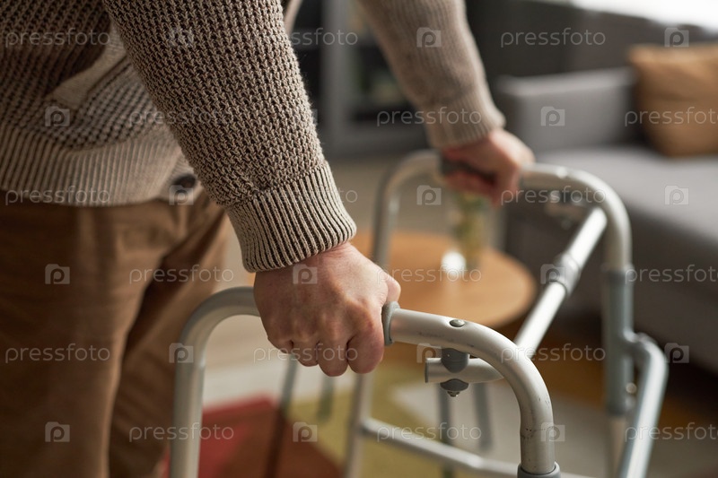Пожилой мужчина ходит с помощью ходунка