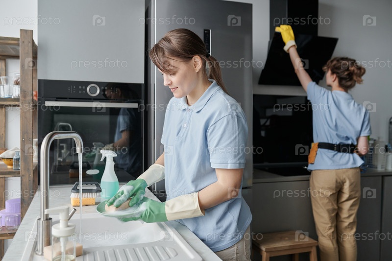 Чистильщик для мытья посуды на кухне во время работы по дому