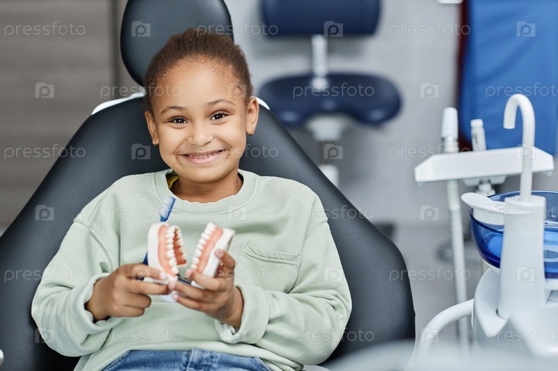 Черная маленькая девочка в стоматологическом кресле, счастливо улыбающаяся на камеру